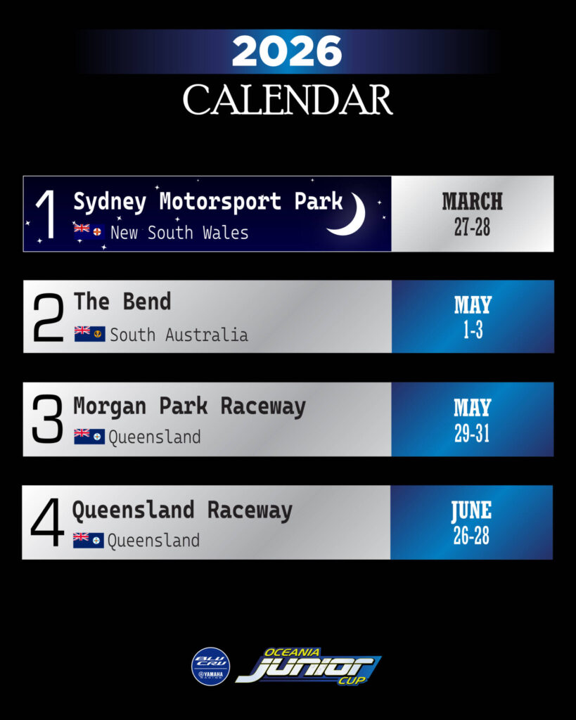 Round one of the 2026 BLU CRU Oceania Junior Cup will be held at Sydney Motorsport Park on March 27-28, alongside the round two Night Race event of the Penrite Australian Superbike Championship presented by Pirelli.