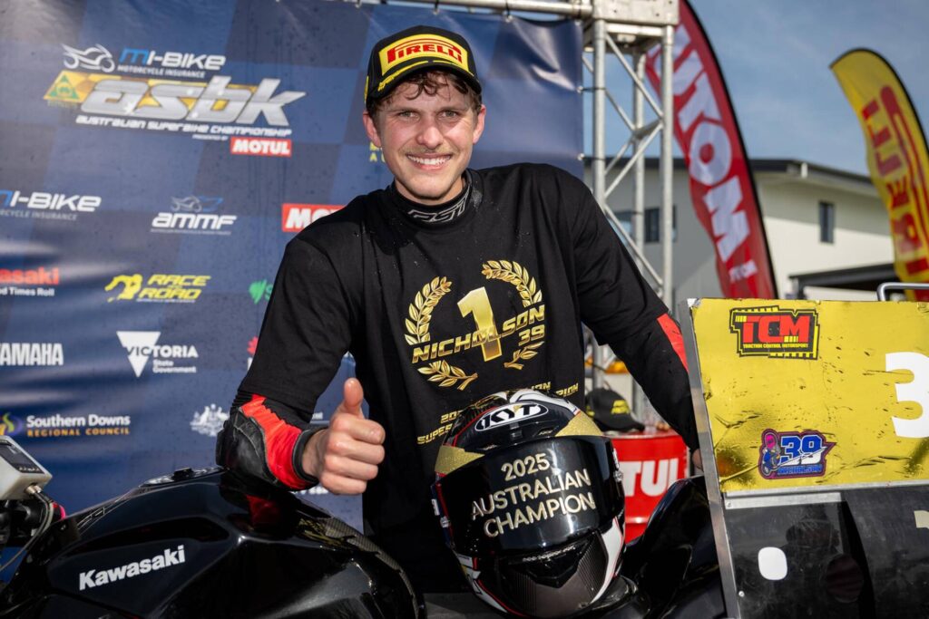 Nicholson (Kawasaki) is the 2025 champion, building an insurmountable lead at One Raceway after his 7-4-4 finishes and a new lap record of 1:05.710.